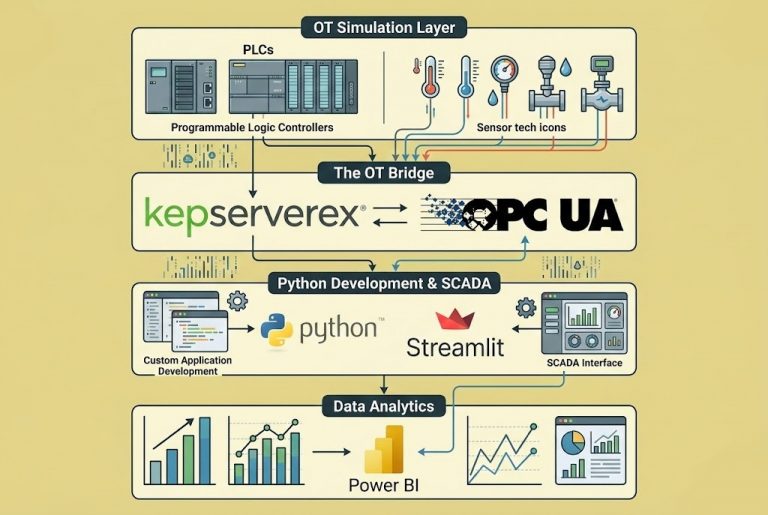 How to Build a Real-Time Industrial SCADA System using Python and KEPServerEX In the era of Industry 4.0 and Digital Transformation, the biggest challenge for factories is making machines that speak dozens of different languages on the shop floor (Siemens…