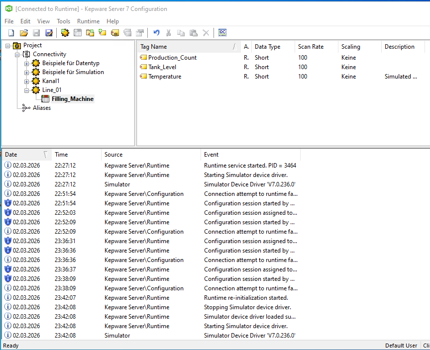 We begin by configuring Kepware, which will be the central hub where our data is collected. In a real-world scenario, “Siemens TCP/IP” or “Modbus” devices would be added here. For this project, we designed a virtual machine line using the “Simulator” driver.