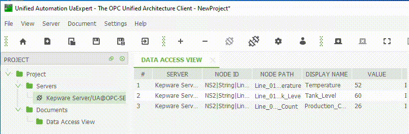 We opened the UAExpert program and connected to Kepware’s local IP address (opc.tcp://127.0.0.1:49320). We located our machine in the address space tree and dragged the tags we created into the “Data Access View” screen. The result: The data was ticking away flawlessly! This step proved to us that any potential errors during the coding phase would originate from our code, not from Kepware.