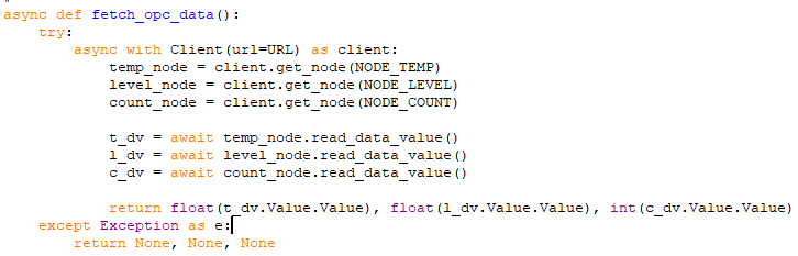 Now it was time to pull this data from Kepware and integrate it into our own application. We established an asynchronous communication loop using Python’s asyncua library.