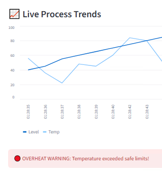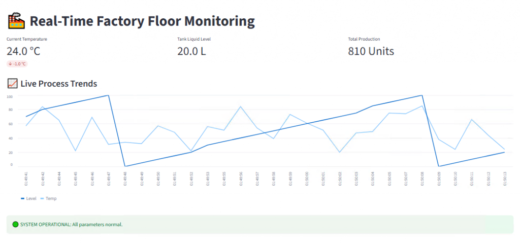 When we fired up our Python code with the python -m streamlit run factory_scada.py command, we were greeted with an industrial-standard monitoring panel. The panel featured real-time temperature, tank level, and trend charts updated every second.