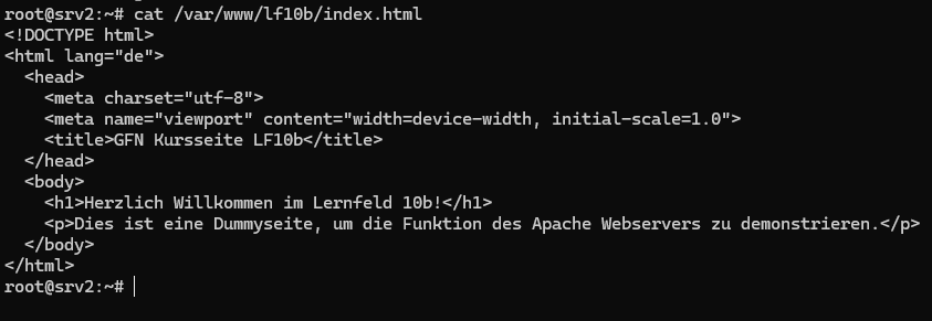 Then we enter this directory and create our site’s homepage. By typing nano /var/www/lf10b/index.html, we add a simple HTML structure inside. This will be our “dummy” page.