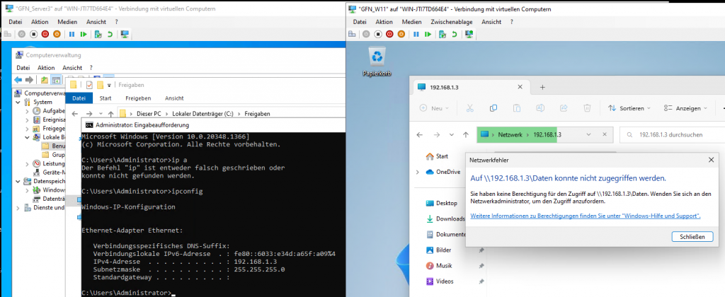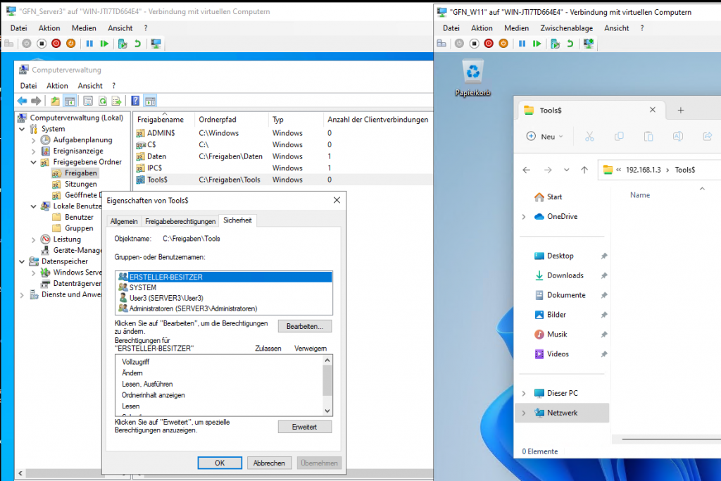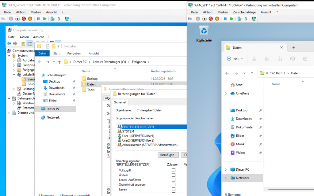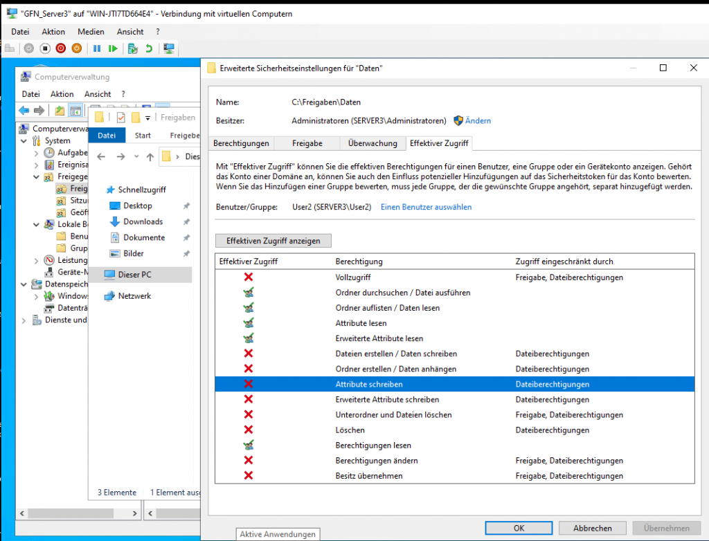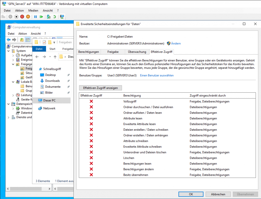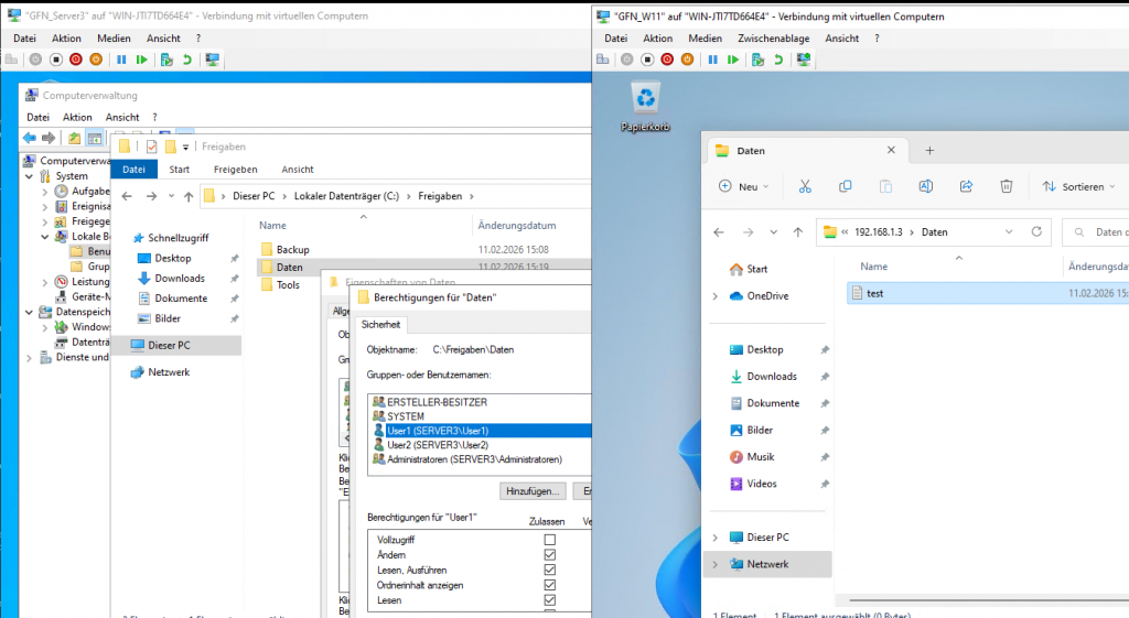 • Verification 1 (User1): Access \\Server3\Daten. You can view files but cannot create or delete them.